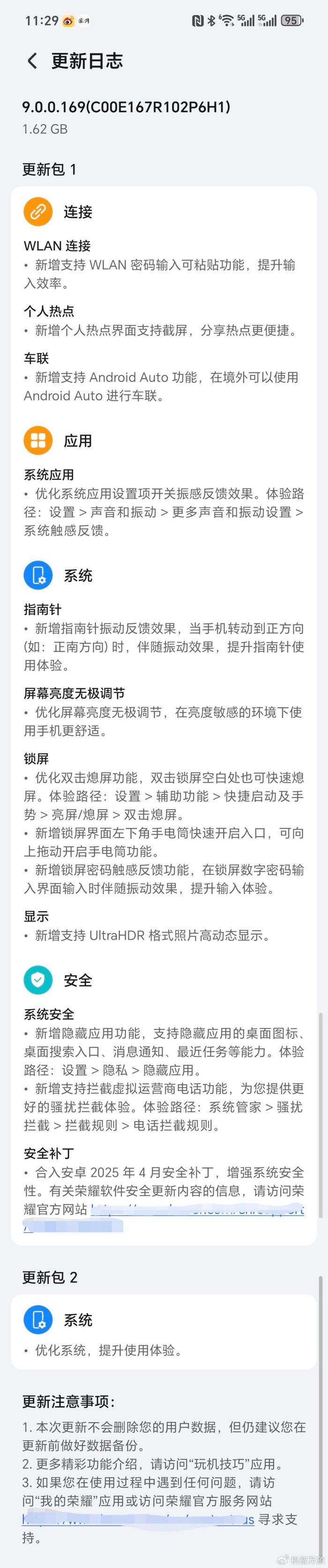 根据更新说明来看,此次升级主要对系统的便捷性、安全性等方面进行了进一步的优化和提升。比如,新增的支持WLAN密码输入可粘贴功能,能更有效的提升输入效率;新增个人热点界面支持截屏,让分享热点更便捷;新增支持Android Auto功能,让用户可以更便捷的在海外使用Android Auto进行车联;新增隐藏应用功能,支持隐藏应用的桌面图标、桌面搜索入口、消息通知、最近任务等能力;新增支持拦截虚拟运营商电话功能,可以带给用户更好的骚扰拦截体验等。