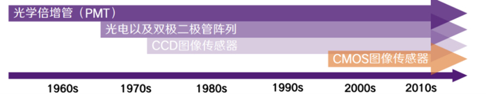 1970年,CCD图像传感器在Bell实验室发明,依靠其高量子效率、高灵敏度、低暗电流、高一致性、低噪音等性能,成为图像传感器市场的主导。