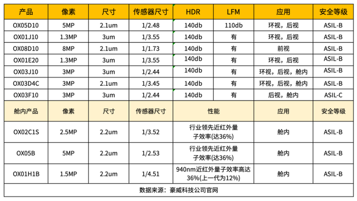 豪威汽车CIS产品豪威科技集中于环视,侧视和舱内的产品。2023 年豪威开始布局前视摄像头,至此公司既有用于前视,环视,侧视,后视,又有舱内用 CIS。从像素来看产品覆盖 1-8MP 像素,车载产品线宽阔。豪威科技的车载CIS芯片已成功进入吉利、蔚来、小鹏以及赛力斯问界等品牌的供应体系。