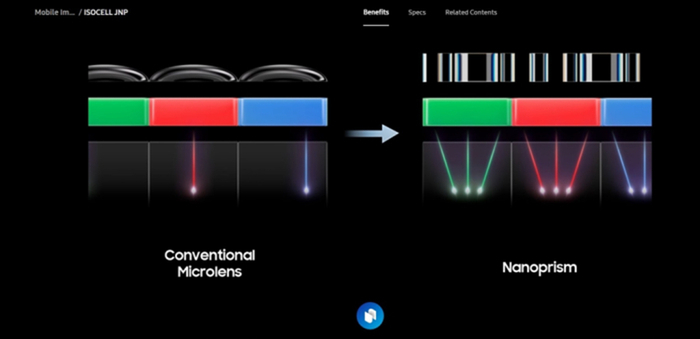 三星的纳米棱镜在微透镜内引入了精细调节的光导,可以将部分光谱重新定向到相邻像素,从而在不增加传感器尺寸的情况下有效增强信号生成。