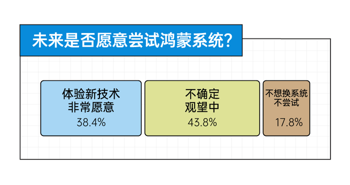 也正因如此,当我们问及年轻人「未来是否愿意尝试鸿蒙系统?」时,38.4%的人表示「愿意上手体验新系统」,43.8%的人抱有期待,愿意继续观察。年轻人既没有盲目追新,也不是刻意保守,他们看得到鸿蒙稳步前进的决心,也愿意敞开一个接纳的窗口。