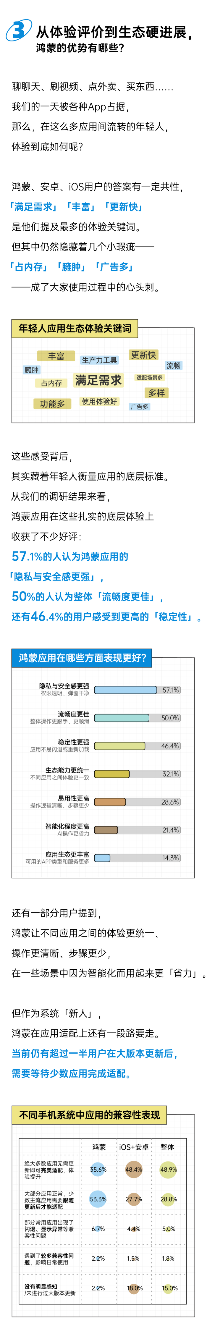 鸿蒙生态正在用越来越丰富、越来越完整的应用生态,回应这届用户越来越细致的体验标准。未来会如何,我们都没有标准答案,但可以确定的是,鸿蒙系统及生态具备持续进化的能力,这两年间,生态体验上的巨大跃升,已经证明了它正向成长的发展潜力:用户的体验反馈、期待将不断推动着生态的迭代和创新,鸿蒙和生态伙伴携手将为这届年轻人带来更多新鲜的App体验!