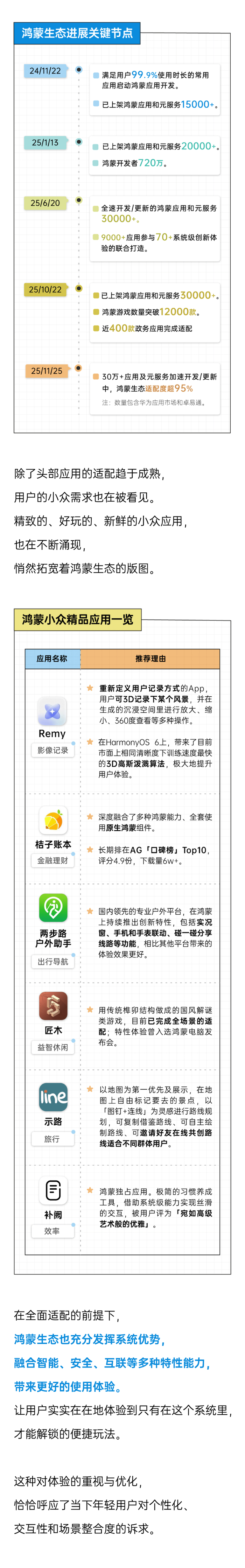 当我们理解了年轻人的底层需求,再反观鸿蒙时就能看出,他们的生态的推进节奏也恰恰是沿着这条需求线向前迈进的——头部应用的高密度适配、功能点的持续加强、系统级体验的更新迭代——这些进步和变化并不只是「生态规模」的展示,更是对用户使用反馈的回应。