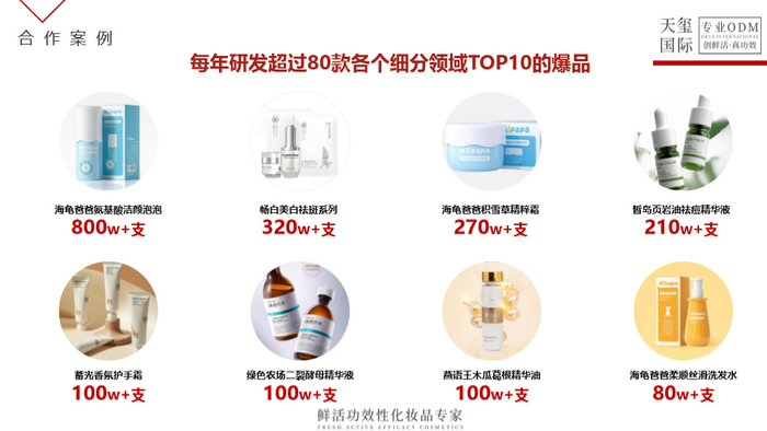 从2004年天玺国际诞生开始,就以“鲜活功效性”的定位,开展OEM/ODM一站式化妆品研发、制造、服务,为客户全方位提供解决方案,通过高品质的婴童级护肤品、功效性化妆品,赋能品牌竞争力,驱动业务长效增长。如今,天玺国际凭借着过硬的产品品质、强大的研发实力和专业的服务,赢得300+品牌信赖。