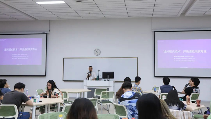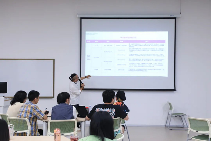 短暂休息后,下午讲座继续。下午讲座就刷新率、视场角及延迟标准等专业角度,带同学们快速了解当前VR市场上的核心硬件产品,并就其优缺点,与同学们展开了互动讨论。