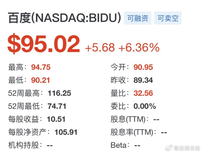 财报发布后,百度美股股价开盘大涨,截至发稿上涨6.36%。