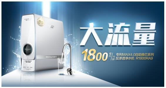此次上市的黑科技新品,专利MAX4.0自助换芯反渗透净水机R1800RA9,拥有高达1800毫升/分钟的大流量出水。接满一杯250ml净水,仅需9秒的畅快体验,刷新了用户对即滤净水机的流量认知,让用户的净水体验“大”不同。