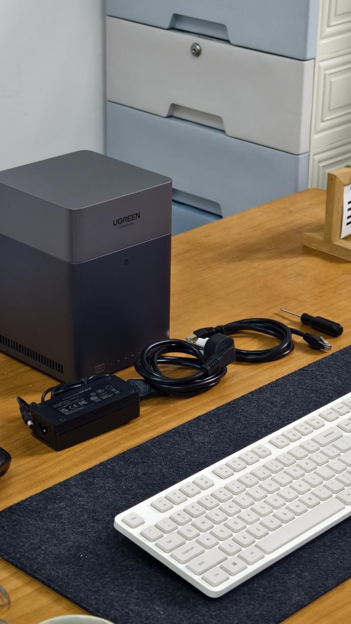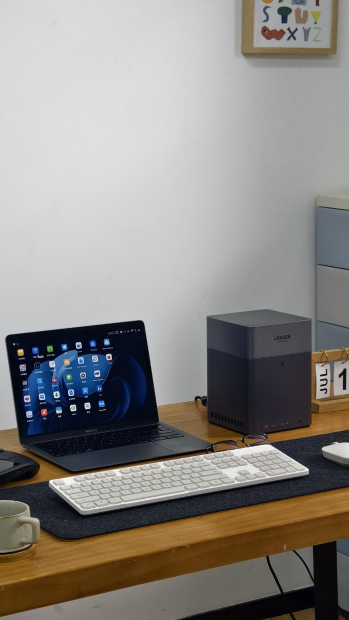 直到闺蜜给我推荐了绿联DH4300 Plus四盘位NAS,一开始我是真犯怵,总觉得这种听起来像“专业服务器”的东西,肯定得懂代码、会设置,对我这种连路由器设置都要找人帮忙的小白来说,简直是天书。结果到手后彻底颠覆了我的认知,它的外观特别简约,银灰拼色的机身方方正正,放在电视柜上和我家的音响、路由器搭在一起,不仅不突兀,反而显得挺有质感。最惊喜的是设置过程,完全不用懂任何专业知识,插上电源和网线后,手机打开NFC往机身正面一贴,直接就弹出了绿联云APP的下载链接,跟着APP里的向导一步步点“下一步”,选硬盘、挑存储模式,十来分钟就完成了初始化。就连听起来高深的RAID模式,系统都配了简单的图文解释,最后我选了RAID 1模式,说能给数据双重保障,哪怕其中一块硬盘坏了,照片视频也不会丢,我这种数码小白跟着提示点几下就好了,全程没遇到一点卡壳。