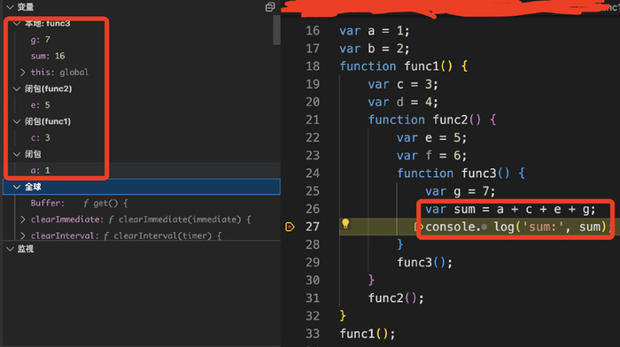 从上图中可知,由于func3内,访问了外部作用域的a、c、e变量,进而从左侧debug中可以看出形成了三个闭包,而b、d、f没有访问,进而没有形成闭包