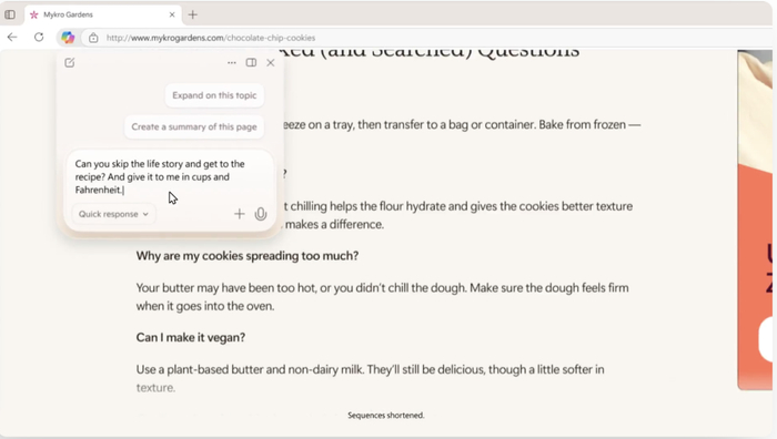 在浏览网页的过程中,也可以随时唤出Copilot提问,如跳过食谱分享博客中的故事部分,直接提取食谱并转换成华氏度等习惯的计量单位。