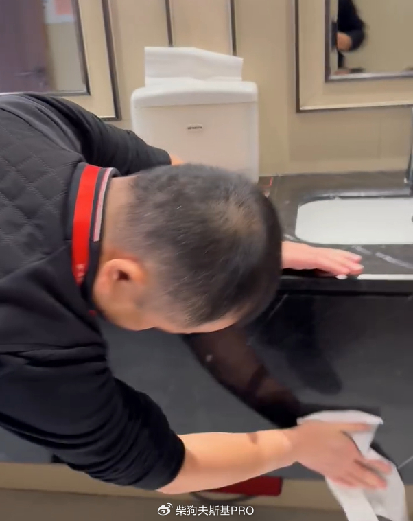 视频中,华杉与总经理肖征配合扫厕所,华杉拿着毛巾认真擦拭台盆,连缝隙都不放过,而肖征则在认真拖地。