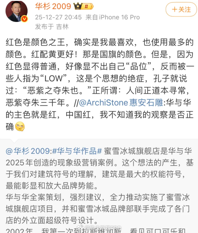 昨日,华杉在社交媒体上开炮,称觉得蜜雪冰城红色设计low,是思想绝症华与华华杉怒怼质疑:觉得蜜雪冰城红色设计low是思想绝症……