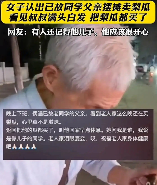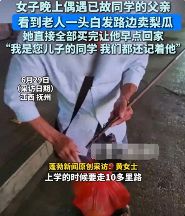 近日,在江西九江街头,发生一件让人感动的事情。一名女子下班骑车回家,路过一个瓜摊时,目光扫过摊主的脸,心头猛地一紧——那是她已故高中同学的父亲。老人坐在小凳上,守着几筐甜瓜,路灯下的身影显得单薄。