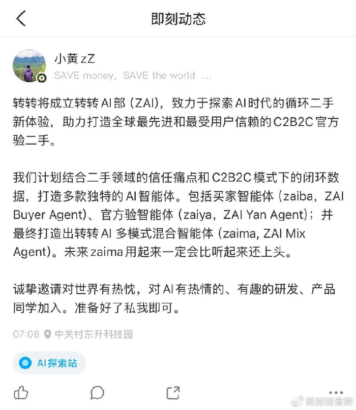 据了解,转转2024年的技术研发投入已达5亿元,在二手交易行业中位居前列。“一直以来,技术研发费用是转转仅次于官方验质检费用的投入。但在AI新浪潮下,我们决定进一步扩大研发投入”,黄炜透露,“三年内投入保守估计20亿”。为此,转转已启动全球AI人才招募计划,重点引进产品、算法、及数据科学领域的专业人才。