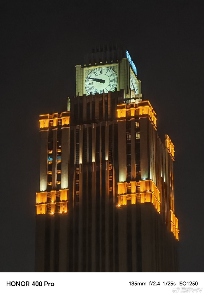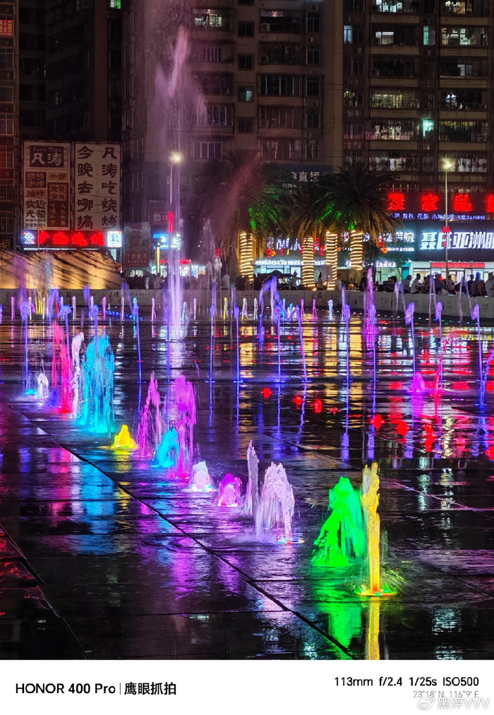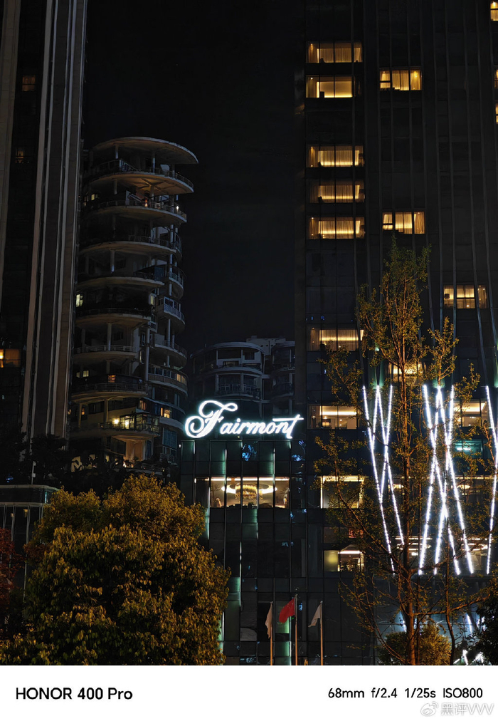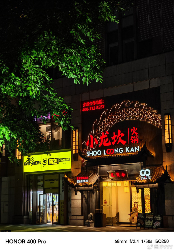 当然,荣耀400 Pro夜景摄影表现出色,能清晰还原店铺招牌细节,灯光色彩真实自然,暗处噪点控制佳,得益于大底传感器与像素融合技术提升进光量,即便在光线复杂场景,也能兼顾明暗部细节,成像纯净度。