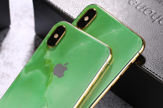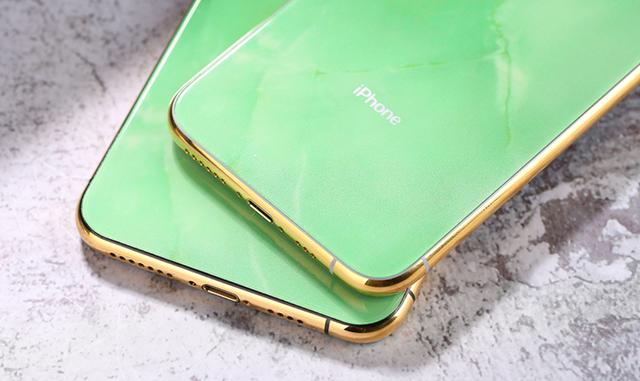 其次,它是一部私人订制版的苹果手机。由国内知名的私人定制品牌匠臻定制操刀设计的这款金镶玉定制版iPhone 11 Pro跟普通版的iPhone 11 Pro相比,它的不同之处就在于它的整个外壳部分,我们从图片中不难看出,它的背板变成了一块有着绿玉纹理的玻璃,而它的按键、边框、镜头边框等外壳构件都被镀上了一层真正的24K黄金。