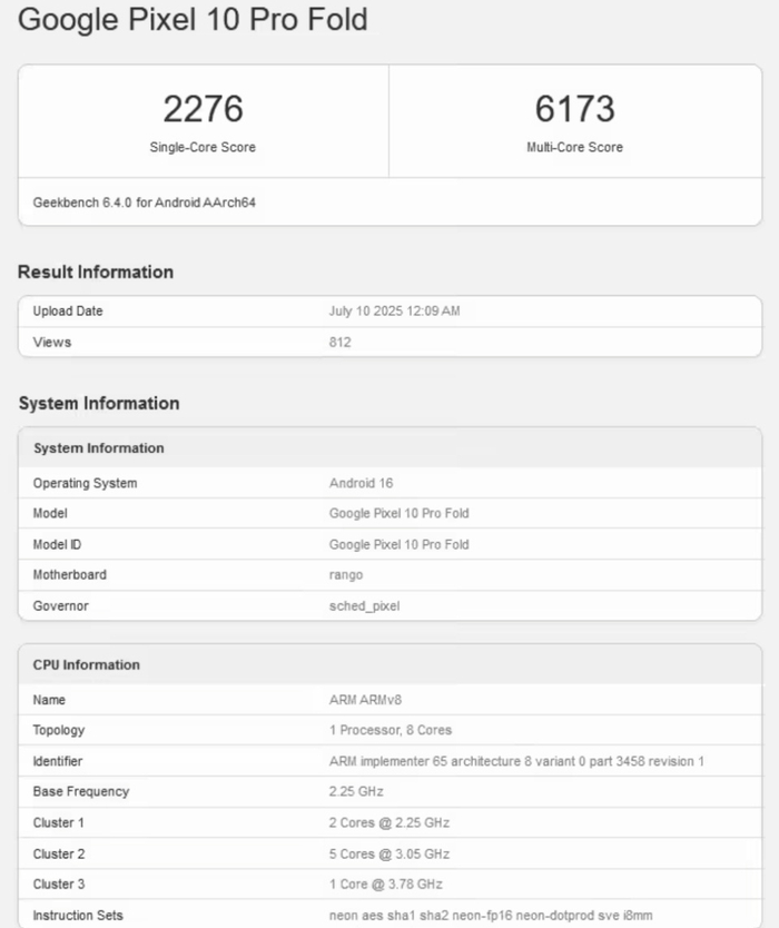 近期有科技媒体曝光了谷歌Pixel 10 Pro Fold折叠手机的GeekBench跑分成绩:单核2276分,多核6173分。