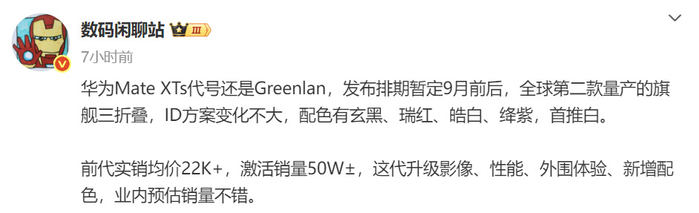 而且前代产品华为Mate XT实销均价超过2.2万元,激活销量约50万部,在高端折叠屏市场创下亮眼成绩。