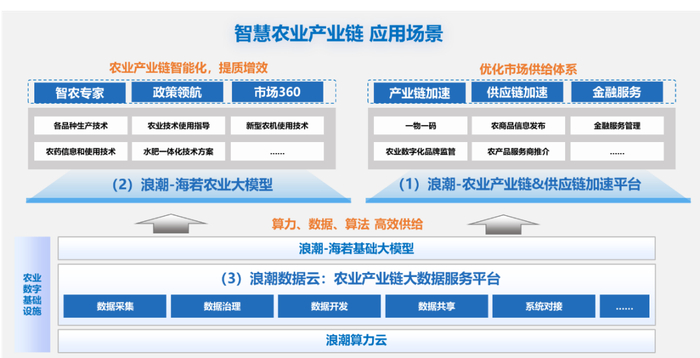 四是丰富数据赋能应用场景,提升数据价值。在农业产业链供应链协同方面,浪潮云农业产业云服务平台加速农业领域数据汇聚,提供农产品数字化管理、产销对接、市场行业监测、品牌运营等服务,实现农业全流程数字化能力升级。在数字农业领域,基于农业语料知识和国产化算力构建浪潮云海若农业大模型,覆盖农业生产、农业管理、农业政策、农业市场分析等多方面,帮助农业从业者和决策者提高农业生产效率、优化农业资源配置。在农业数据资源入表与交易领域,浪潮云农业数据空间支撑推动涉农企业所属数据资源入表,通过开展数据质量评价、数据资产评估等工作,有效提高企业信用评级、拓宽融资渠道、增强融资能力。