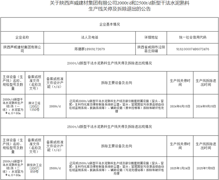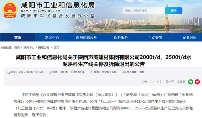 8月18日,咸阳市工业和信息化局发布《关于陕西声威建材集团有限公司2000t/d、2500t/d水泥熟料生产线关停及拆除退出的公告》称:
