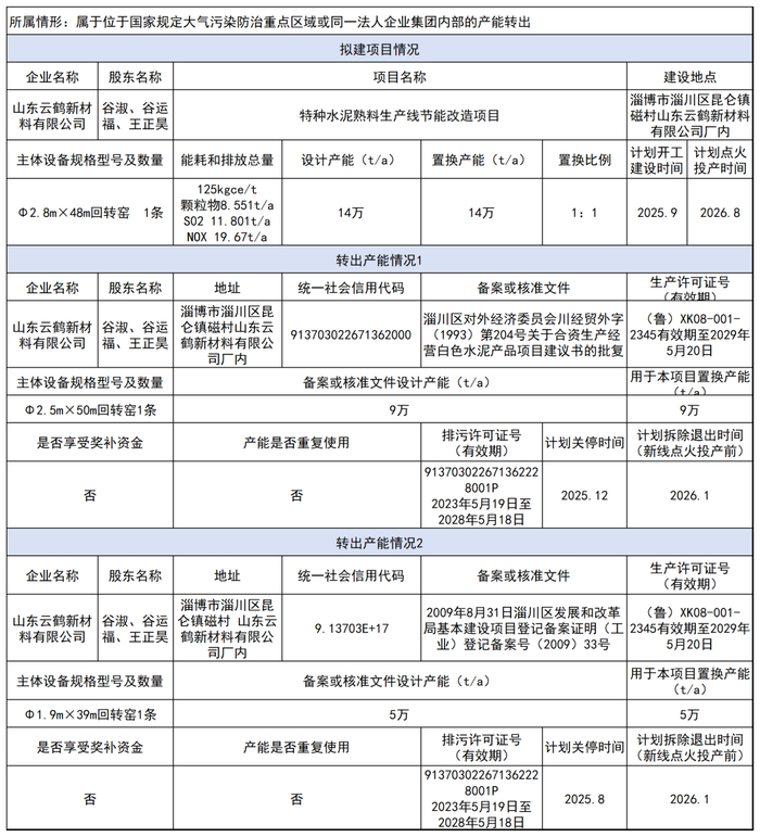 山东云鹤新材料有限公司年产14万吨特种水泥熟料生产线节能改造项目产能置换方案