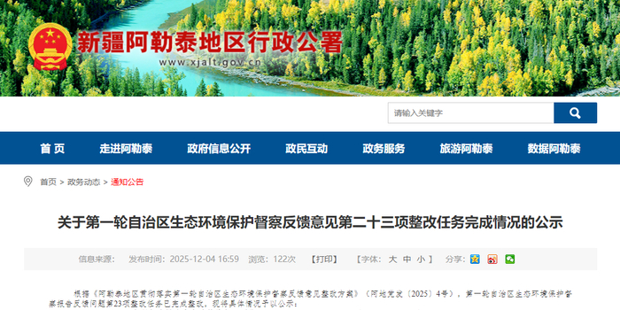 12月4日,新疆阿勒泰地区行政公署发布《关于第一轮自治区生态环境保护督察反馈意见第二十三项整改任务完成情况的公示》,文件称根据《阿勒泰地区贯彻落实第一轮自治区生态环境保护督察反馈意见整改方案》(阿地党发〔2025〕4号),第一轮自治区生态环境保护督察报告反馈问题第23项整改任务已完成整改,现将具体情况予以公示,公示时间为2025年12月4日至12月17日,共10个工作日。