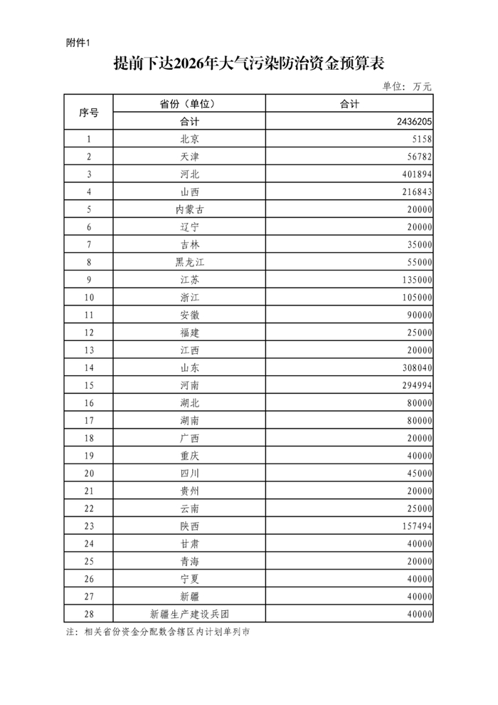 为支持大气污染防治工作,促进大气质量改善,现下达你省(自治区、直辖市、新疆生产建设兵团,以下统称省)2026年大气污染防治资金,用于支持开展减污降碳等方面相关工作,并就有关事项通知如下: