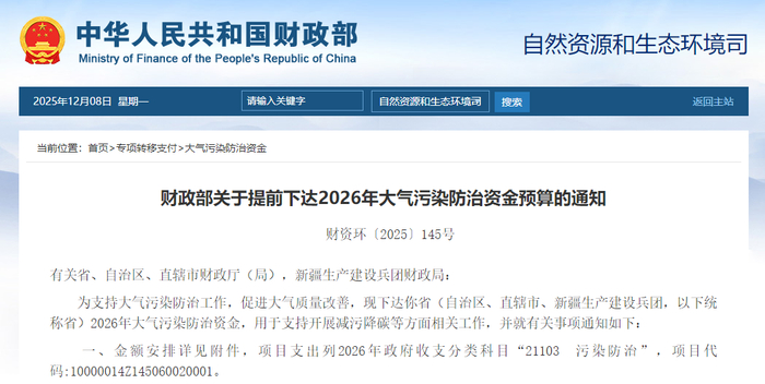 财政部关于提前下达2026年大气污染防治资金预算的通知