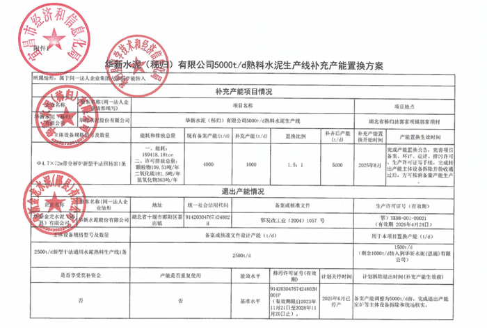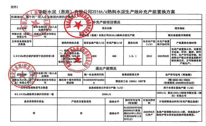 文件显示,华新水泥(恩施)有限公司一条1850t/d水泥熟料生产线补充产能666t/d,调整后产能为2516t/d,置换比例1.5:1。