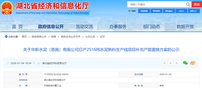 同日,关于华新水泥(恩施)有限公司日产2516吨水泥熟料生产线项目补充产能置换方案的公示发布,文件称按照工业和信息化部关于印发《水泥玻璃行业产能置换实施办法(2024年本)》的通知(工信部原〔2024〕206号)有关规定和水泥行业产能管理相关政策要求,现对华新水泥(恩施)有限公司日产2516吨水泥熟料生产线项目补充产能置换方案予以公示。公示时间为2026年1月4日—2026年1月15日。