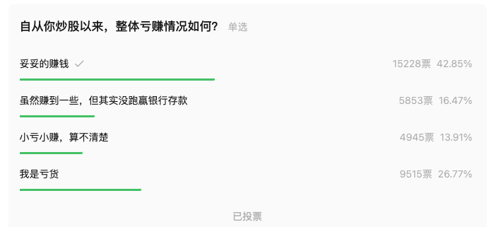 和我估计的差不多,在目前牛市中,有超过40%的人自从炒股以来美滋滋,不仅赚钱,还能跑赢银行利率,也就是至少年化收益有3%以上。如果从绝对收益角度来看,则一共有接近60%的人赚钱。说明虽然我村是个不怎么样的市场,但每次来牛市还是能给大部分人解套的,今次依然体现了这个规律。