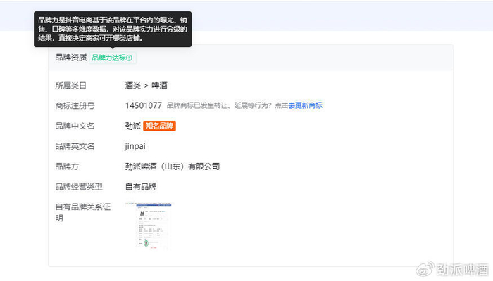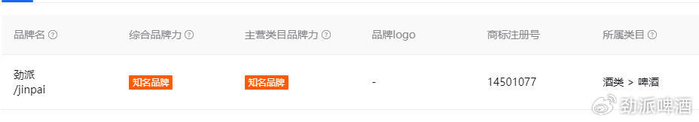 双重认可,彰显专业与综合实力在此次评估中,劲派啤酒(商标注册号:14501077)表现突出:- 主营类目品牌力(酒类 > 啤酒)被评为“知名品牌”这意味着在啤酒这一垂直赛道中,劲派凭借其产品力、类目渗透与用户忠诚度,已跻身平台认可的知名品牌行列。