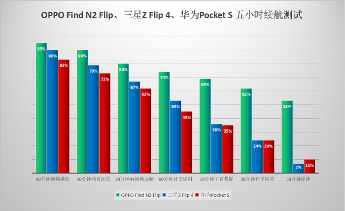 值得一提的是,华为pocket S和三星Z Flip 4在手机续航的问题上,表现也有点让人失望。OPPO Find N2 Flip、华为pocket S和三星Z Flip 4三款机型搭载的电池容量分别为4300mAh、4000mAh和3700mAh,从纸面上看相差不远,但从五小时的实测表现来看,差距就拉开了。OPPO Find N2 Flip在测试结束后,剩余电量超过了50%,甚至可以和隔壁的直板机一较高下,而华为pocket S和三星Z Flip 4的剩余电量都不超过10%,让人很容易有电量焦虑。