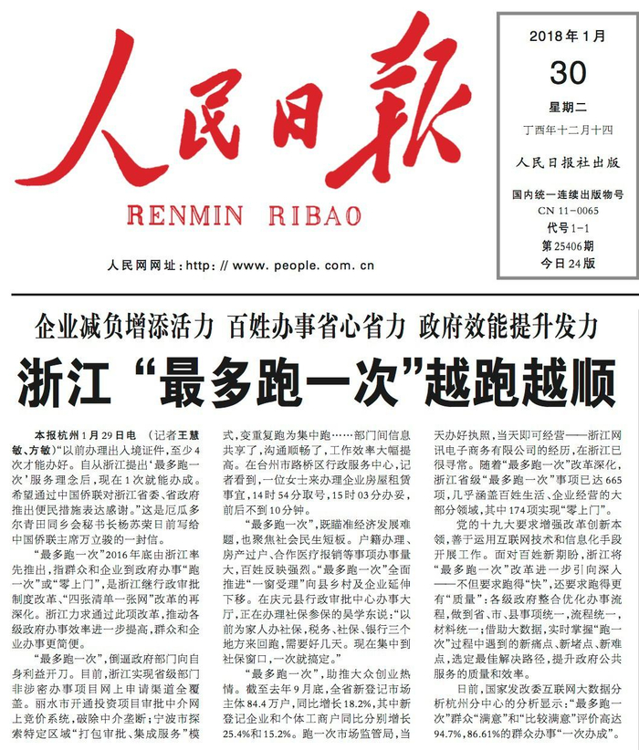 在今年的全国两会上,“最多跑一次”首次写入了政府工作报告。之前,在首届数字中国建设峰会上,浙江“最多跑一次”再获认可。更厉害的是,今年年初,人民日报还评论了浙江“最多跑一次”,点赞越跑越顺。