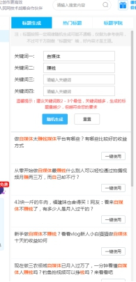 大家在取标题之前肯定是会选择关键词进行选题的,比如最近很热门的一些热点,这里举个例子“自媒体”“赚钱”,这里就可以直接用易撰标题生成工具来进行标题的创作,在易撰主页的编辑器左边有一个标题生成工具。这里我把“自媒体”“赚钱”这两个关键词输入进去,你们就可以看到,这个工具会自动生成一些标题,你可以选择自己想要进行修改,你们可以去尝试一下。