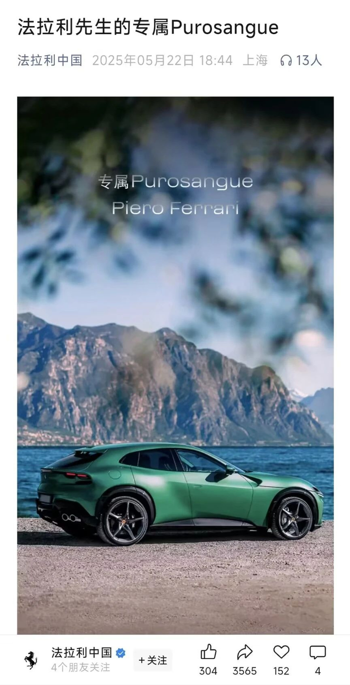 就在发布会的前十几分钟,法拉利中国发了一张图:《法拉利先生的专属Purosangue》。很巧合,也是绿色的。据悉,这款是恩佐·法拉利之子,皮耶罗·法拉利的定制色。