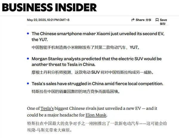 不过在外媒看来,小米YU7威胁最大的,还是特斯拉Model Y。