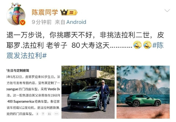 “陈震发了法拉利”的词条也在今早,迅速登上微博热搜。