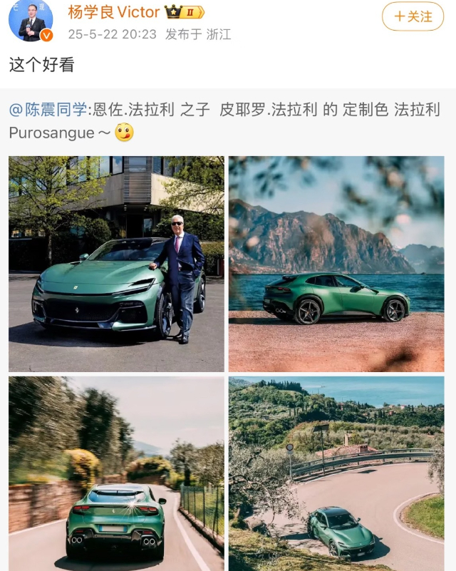 随后,知名博主陈震也在微博上发了这一消息,晒出法拉利照片,吉利副总裁杨学良也转发评论,夸法拉利好看。但却被部分网友理解为是在“内涵”小米。一群网友直接在评论区吵了起来。