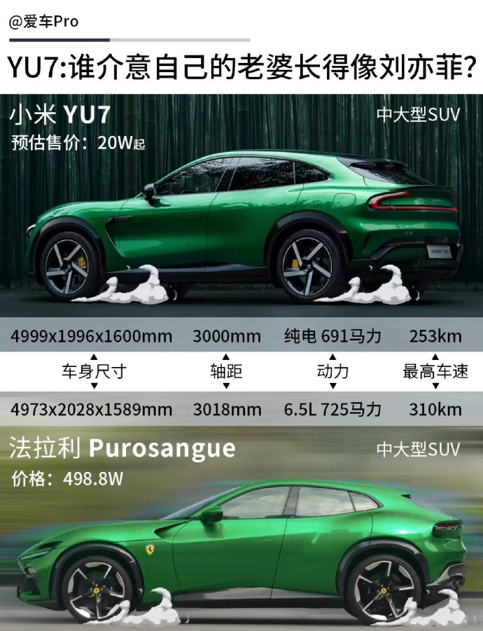 外观上,小米YU7和法拉利Purosangue,车身尺寸、轴距都相差不大;