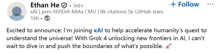 不久前,何宜晖在其社交账号上发帖称:“激动地宣布:我将加入xAI,帮助加速人类对宇宙的探索!Grok 4解锁了AI的新领域,我迫不及待地想要深入探索并突破可能的界限。🚀”