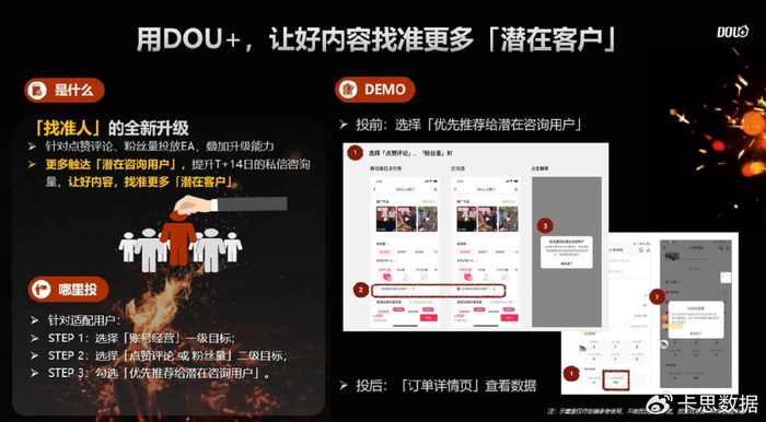 以上,卡思论述的主要是针对视频场景下的投放策略。同样,在直播场景下,DOU+也可以通过直接加热直播间或视频引流直播间,提高直播间的曝光率和热度,为创作者带来更多的目标观众,在此卡思不再赘述。