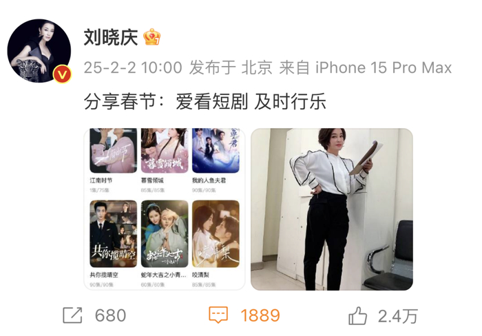 去年重新翻红的知名演员刘晓庆,春节期间也晒出了自己在红果短剧的追剧片单。作为资深红果短剧迷,她还通过抖音官宣计划拍摄一部短剧,激起了网友的集体狂欢,纷纷表示“短剧迎来真正大女主”“74岁正是闯的年纪”。
