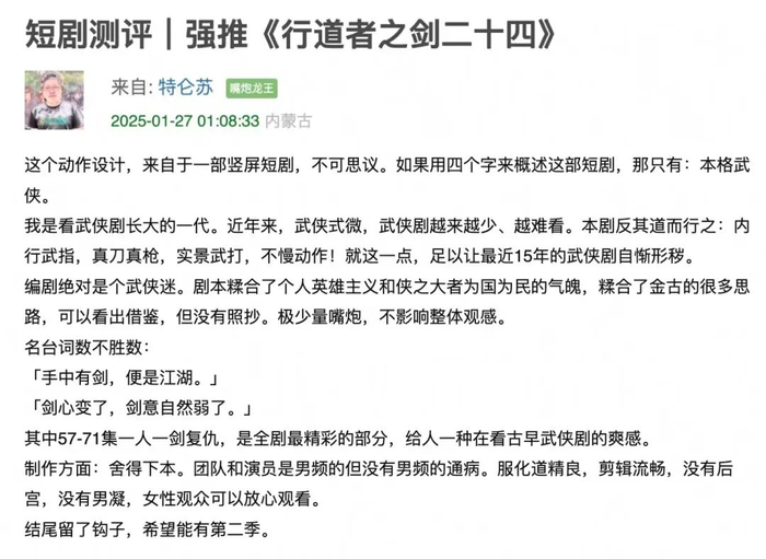 在豆瓣“爱短剧组”,一位观众激动地按头安利“我是看武侠剧长大的一代,近年来武侠剧越来越少、越难看。本剧反其道而行之:内行武指,真刀真枪,实景武打,不慢动作!足以让最近15年的武侠剧自惭形秽。”这样真情实感的推荐,也获得了组员们的群起响应。在新腕儿、鞭牛士联合推出的短剧热度榜上,《剑二十四》也成功登顶,意味着揉合了个人英雄主义与“为国为民”情怀的武侠题材,仍然有着广泛的受众基础,而精品短剧有望使之重新成为热门赛道。