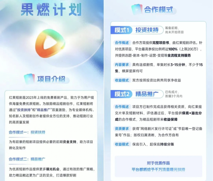 去年12月,红果短剧正式发布面向全行业精品短剧合作的“果燃计划”,通过“投资扶持”和“精品推广”双重激励,通过联合投资、保底分账等模式,从前期创作到后期宣发运营提供全方位支持,让精品创作者得到足够的回报,带动更多传统影视专业团队投身短剧,刺激行业水准不断提高。从红果短剧春节档精品迭出的表现来看,“果燃计划”已经取得了一定成效,正悄然改变着行业的走向。