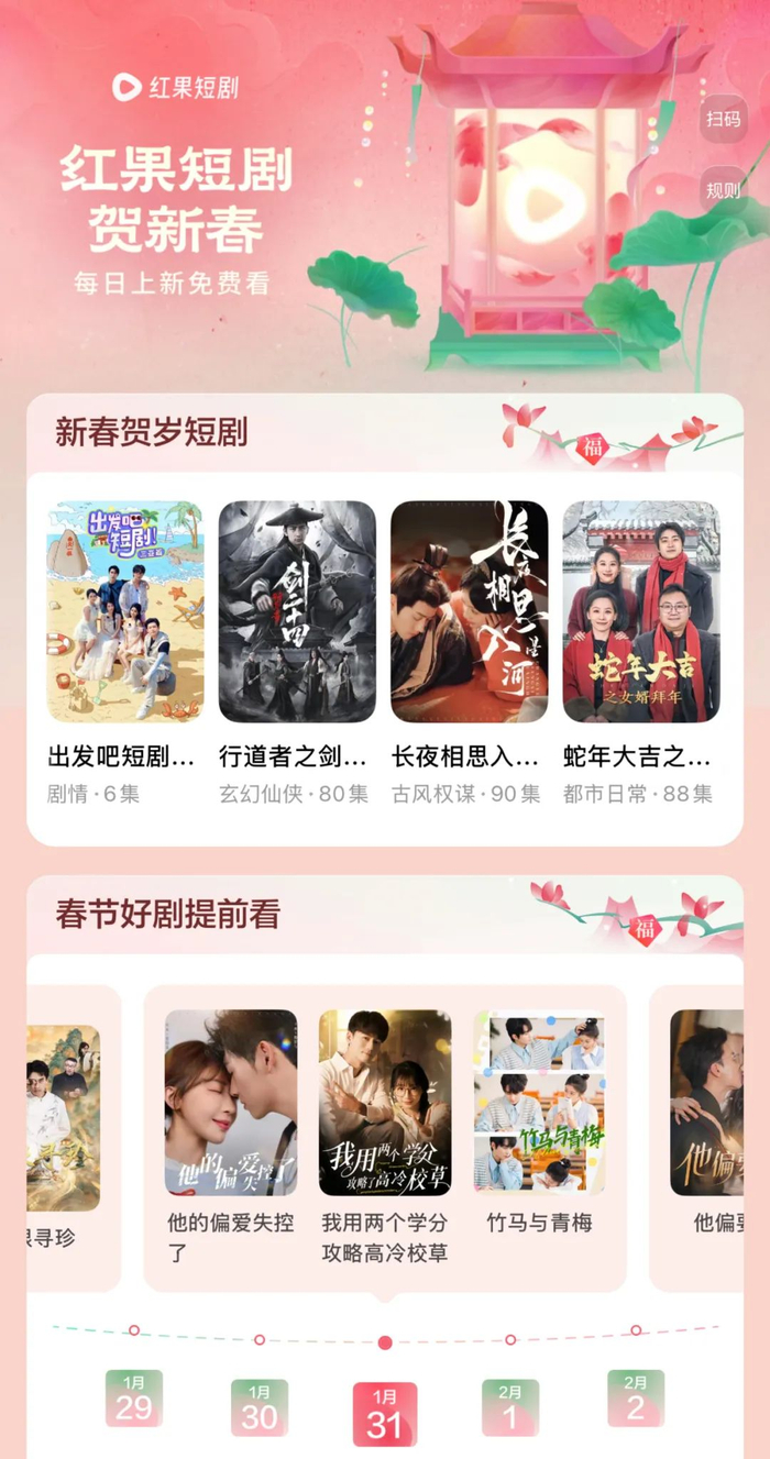 据了解,今年首个免费短剧春节档,红果短剧携手30余家机构,推出了100余部高品质短剧,分为12大主题会场,涵盖古装武侠、都市爱情、爱国谍战、青春成长等多个内容方向,每个人都可以从中找到自己喜欢的故事,在短剧中度过一个精彩、难忘的假期。