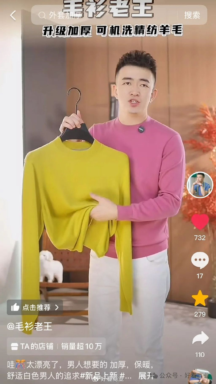 王刚是一名服装设计师,2023年9月,他注册了“毛衫老王”,聚焦男式毛衫,并开始在抖音通过短视频和直播带货。一年多时间就脱颖而出,在男式毛衫这个细分赛道,毛衫老王的成长速度堪称迅速。