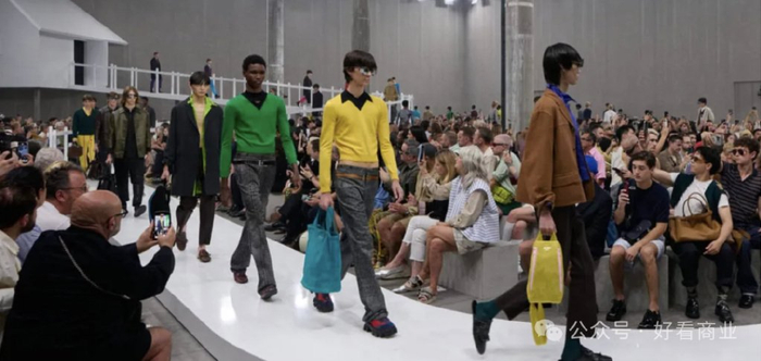 在雷军之外,男装采用亮色已经成为越来越多国际大牌当下的流行趋势。比如在2025米兰春夏男装时装上,从Gucci、Prada到Balenciaga、Comme des Garcons等大牌的秀场中,绿色、粉色、紫色、橙色、胭脂红等清新色调的男装闪亮登场,用青春、活力表达新的时尚与前卫。
