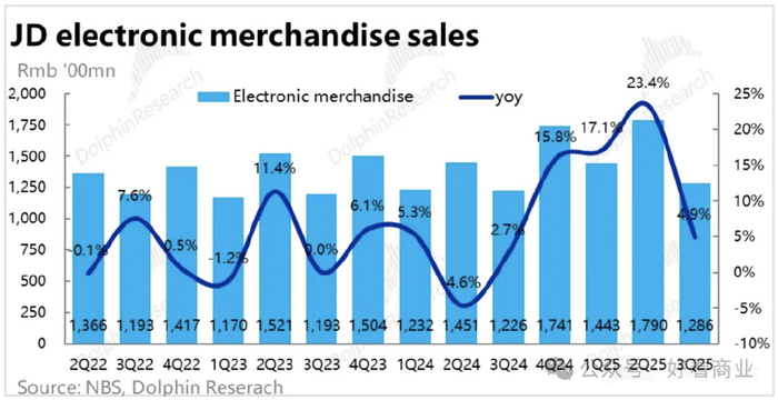京东通电产品季度营收及同比增幅,图片来源:海豚投研