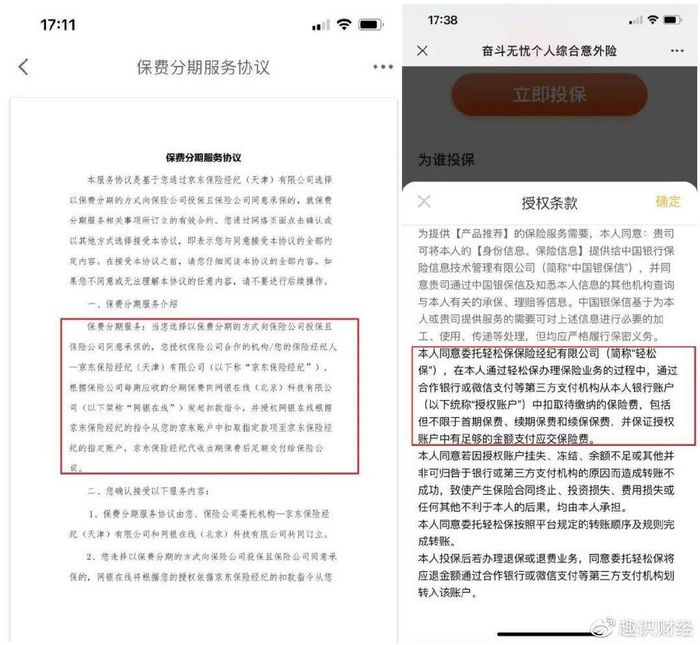 对于保费分期服务,京东金融在相关协议中解释为,用户授权京东保险经纪,根据保险公司每期应收的分期保费向网银在线发起扣款指令,并授权网银在线根据指令从用户的京东账户中扣取款项至京东保险经纪的指定账户。京东保险经纪代收保费后足额交付给保险公司。
